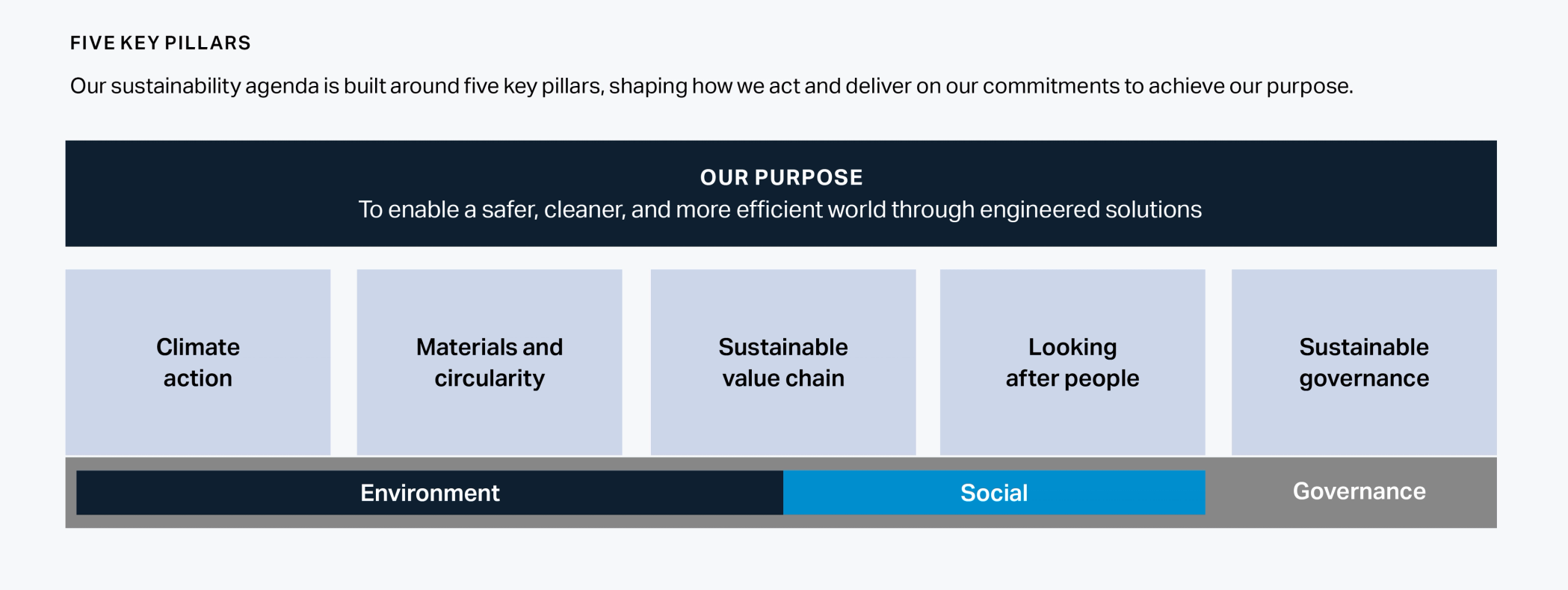 Our sustainability agenda is built around five key pillars, shaping how we act and deliver on our commitments to achieve our purpose.
